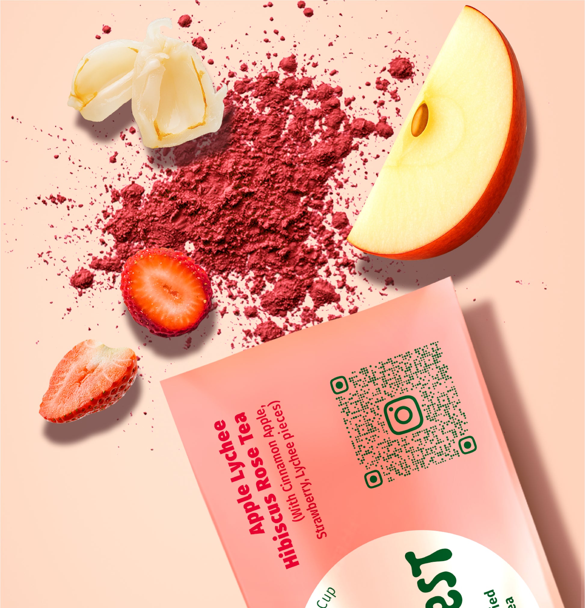 Freeze-dried hibiscus tea powder (16%), freeze-dried rose tea powder, freeze-dried lychee, freeze-dried strawberry, apple chips with cinnamon(96% apples, 3% ground cinnamon, apple juice concentrate)